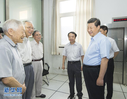 7月17日,中共中央總書(shū)記、國(guó)家主席、中央軍委主席習(xí)近平到中國(guó)科學(xué)院考察工作。這是習(xí)近平同當(dāng)年參與北京正負(fù)電子對(duì)撞機(jī)建設(shè)和應(yīng)用的3位院士交談。新華社記者 李學(xué)仁 攝