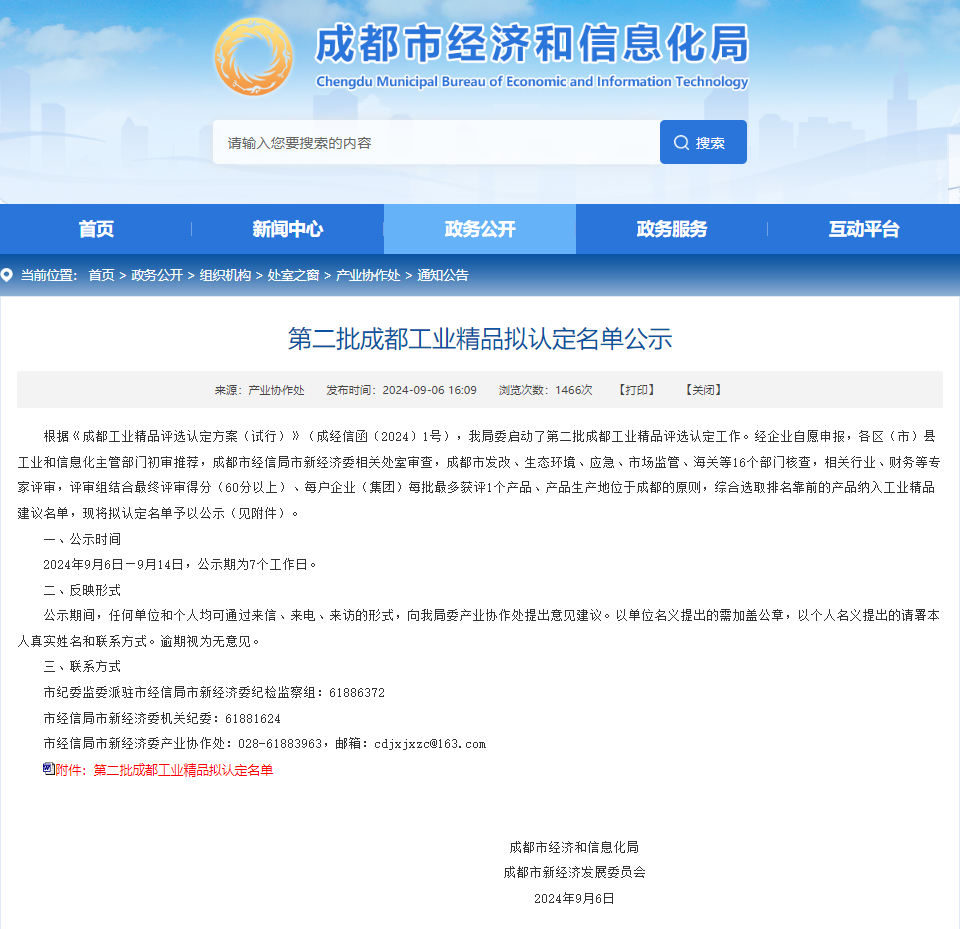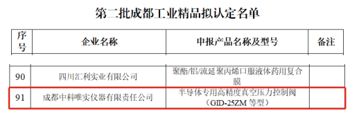 2024年9月6日,成都市經(jīng)濟和信息化局公示了第二批成都工業(yè)精品擬認定名單,成都中科唯實儀器有限責任公司的半導體專用高精度真空壓力控制閥(GID-25ZM等型)產(chǎn)品通過成都市經(jīng)信局市新經(jīng)濟委相關處室審查,成都市發(fā)改、生態(tài)環(huán)境、應急、市場監(jiān)管、海關等16個部門核查,相關行業(yè)、財務等專家評審,成功認定成為了成都工業(yè)精品。