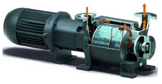 真空技術(shù)從未停止發(fā)展——不僅是在近些年,數(shù)十年來真空技術(shù)一直在不斷發(fā)展。如今,干式螺桿真空泵被應(yīng)用于化工技術(shù),而在其它應(yīng)用領(lǐng)域,爪型干式真空泵已成為常規(guī)的真空泵。油潤滑旋片真空泵也在多種應(yīng)用領(lǐng)域中體現(xiàn)著它的最先進(jìn)技術(shù),原因在于其仍然在不斷發(fā)展。在諸多應(yīng)用領(lǐng)域,這些真空泵通常為最常用的真空泵。盡管真空泵在技術(shù)上有諸多改進(jìn)、新發(fā)展以及進(jìn)一步提升,然而在某些應(yīng)用中,真空產(chǎn)生的原理之一——液環(huán)真空泵仍沿用至今并依然卓有成效。 圖1: Dolphin液環(huán)真空泵的兩種版本,抽速可用范圍從25到26,800立方米每小時(shí) 液環(huán)真空泵的原理早在1890年就有研究,即"水環(huán)泵"。由于其結(jié)構(gòu)簡單而堅(jiān)固,液環(huán)真空泵(圖1)適用于抽除潮濕氣體或蒸汽,或者被抽氣體在真空泵內(nèi)部的壓縮過程中發(fā)生冷凝的應(yīng)用中。液環(huán)真空泵特別適用于潮濕的工藝和粗真空的工藝技術(shù),諸如化學(xué)工業(yè)和石油生產(chǎn)和加工、汽輪機(jī)凝汽器抽真空以及塑料工業(yè)、造紙業(yè)、食品工業(yè)和多種其他工業(yè)應(yīng)用。 工作原理 液環(huán)真空泵的工作液可以使用水或與被抽氣體或蒸汽相容的液體作為工作液。乙二醇、礦物油或有機(jī)溶劑,以及工藝流程中使用到的液體可用作泵的工作液。不同規(guī)格大小和版本的泵,其基本原理是相同的。 圖2: Dolphin液環(huán)真空泵壓縮腔室的剖面圖 偏心安裝的葉輪在圓柱形泵殼(圖2)中旋轉(zhuǎn)。向泵殼灌注工作液,使葉輪葉片浸沒在工作液中。葉輪旋轉(zhuǎn)和隨之產(chǎn)生的離心力使泵殼內(nèi)的液體形成所謂的液環(huán)。氣體被抽入到泵送的介質(zhì)被傳輸?shù)饺~片和液環(huán)之間的空間內(nèi)。葉輪的偏心旋轉(zhuǎn)改變了這些空間的容積,借此吸入、壓縮并排出氣體。液環(huán)將各級空間密封為泵腔。因此,該液體有時(shí)候被稱為密封液,而不是工作液。 機(jī)理 基于所使用的工作液,該機(jī)理僅能在粗真空范圍內(nèi)使用。這是因?yàn)榭蛇_(dá)到的真空度取決于通過真空泵不斷抽送的工作液的蒸汽壓和黏度。這個(gè)要求液環(huán)真空泵需要在相對較低的溫度下運(yùn)行,同時(shí)由于是等溫運(yùn)行,這意味著被抽介質(zhì)在泵的壓縮過程中不會被升溫。因此,液環(huán)真空泵特別適合用于抽除含濕度高的蒸汽和氣體。真空泵內(nèi)的低溫有利于被抽蒸汽的冷凝。在一定程度上,這意味著真空泵還可以作為冷凝器使用,由于混合物進(jìn)入真空泵時(shí)會發(fā)生冷凝,大大縮小了被抽氣體的體積。除了冷凝效果,還提高了額定抽速。 工作液轉(zhuǎn)移壓縮熱量,即支持冷凝和提高抽速的過程。液環(huán)真空泵的一大顯著優(yōu)點(diǎn)在于:組件所用材料和工作液可根據(jù)泵送介質(zhì)進(jìn)行調(diào)整。這使其可以抽除腐蝕性氣體或易爆氣體以及蒸汽。由于運(yùn)行溫度低,因此相比使用其他機(jī)械真空泵,在所有情況下均認(rèn)為液環(huán)真空泵抽除易爆物質(zhì)所產(chǎn)生的問題更少。 結(jié)構(gòu) 單級液環(huán)真空泵和雙級液環(huán)真空泵之間有著根本區(qū)別。在單級液環(huán)真空泵中,在一個(gè)壓縮階段內(nèi)執(zhí)行上述壓縮流程。而在雙級真空泵中(圖3),第一階段預(yù)壓縮的泵送介質(zhì)被輸送到第二壓縮階段并再次壓縮。單級液環(huán)真空泵可實(shí)現(xiàn)130hPa (mbar) 的極限壓力,雙級液環(huán)真空泵可達(dá)到最高33hPa (mbar) 的極限壓力。 圖3: 通過雙級液環(huán)真空泵的氣流 結(jié)構(gòu)尺寸也有明顯差異。在Dolphin液環(huán)真空泵產(chǎn)品組合中,普旭(Busch)真空泵和真空系統(tǒng)擁有不同產(chǎn)品系列和版本,抽氣速率從25到26,800立方米每小時(shí)不等。 運(yùn)行方式 泵的工作液的進(jìn)和出可通過三種方式實(shí)現(xiàn): 1. 流體非再循環(huán)運(yùn)行 這是運(yùn)行液環(huán)真空泵的最簡單方式,在工作液足夠時(shí)均可用。持續(xù)不斷地為泵的壓縮腔提供工作液,然后工作液與氣體和冷凝水一起排出泵體。 2. 開放式流體回路 在開放式回路中(圖4),工作液流出真空泵后與氣體一起被排到液體分離器中,液體和氣體在此分離,當(dāng)氣體被排出液體分離器的同時(shí),新的工作液會補(bǔ)充進(jìn)入液體分離器。通過液體分離器,向回路供應(yīng)補(bǔ)充的全新工作液。這保證了回路中有充足的工作液,且溫度不會上升。與非循環(huán)運(yùn)行模式相比,開放式回路可節(jié)省多達(dá) 50% 的工作液。 圖4: 工作液局部循環(huán)系統(tǒng)的 Dolphin 液環(huán)真空泵 3. 閉合式流體回路 閉合式回路中在真空泵的排氣口也設(shè)有液體分離器(圖5)。氣體從分離器排出,同時(shí)在工作液再次進(jìn)入真空泵之前先經(jīng)過熱交換器,這樣,工作液可以得到不斷冷卻。這種配置可節(jié)省95%的工作液。這意味著只有少量新鮮工作液需要通過液體分離器進(jìn)行添加。因此,在沒有足夠工作液的情況下,或者需要盡可能節(jié)省工作液時(shí),我們建議使用閉合式回路。 圖5: 工作液整體循環(huán)系統(tǒng)的 Dolphin 液環(huán)真空泵 量身定制的