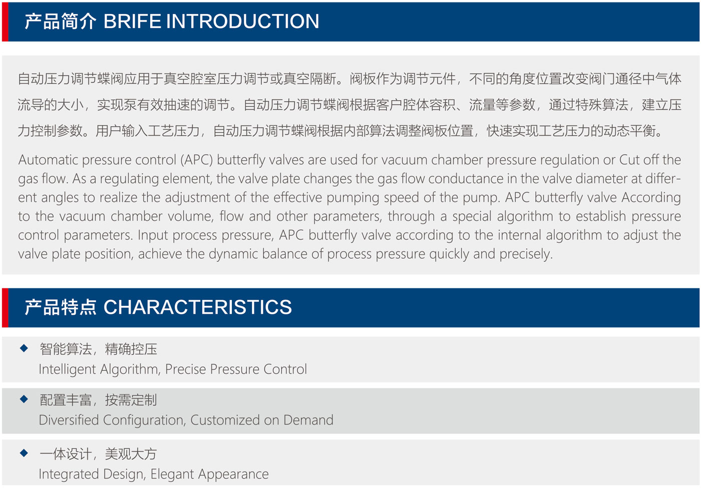 自動(dòng)壓力調(diào)節(jié)蝶閥應(yīng)用于真空腔室壓力調(diào)節(jié)或真空隔斷。閥板作為調(diào)節(jié)元件,不同的角度位置改變閥門通徑中氣體流導(dǎo)的大小,實(shí)現(xiàn)泵有效抽速的調(diào)節(jié)。自動(dòng)壓力調(diào)節(jié)蝶閥根據(jù)客戶腔體容積、流量等參數(shù),通過特殊算法,建立壓力控制參數(shù)。用戶輸入工藝壓力,自動(dòng)壓力調(diào)節(jié)蝶閥根據(jù)內(nèi)部算法調(diào)整閥板位置,快速實(shí)現(xiàn)工藝壓力的動(dòng)態(tài)平衡。